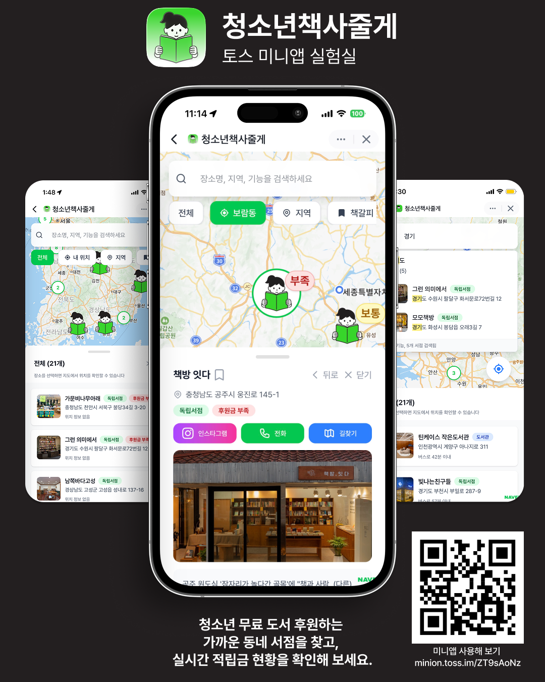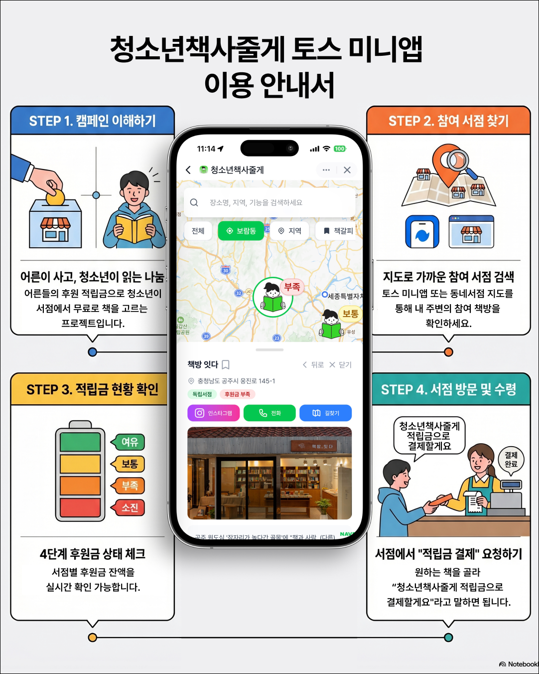 어른이라면 미니앱을 통해 후원이 시급한(상태가 '부족' 또는 '소진'인) 서점을 확인하고, 해당 서점에 직접 연락해 후원할 수 있다. 추후 앱 내에서 직접 후원금을 결제할 수 있는 기능이 추가되면, 더욱 간편하게 나눔에 참여할 수 있게 될 전망이다.