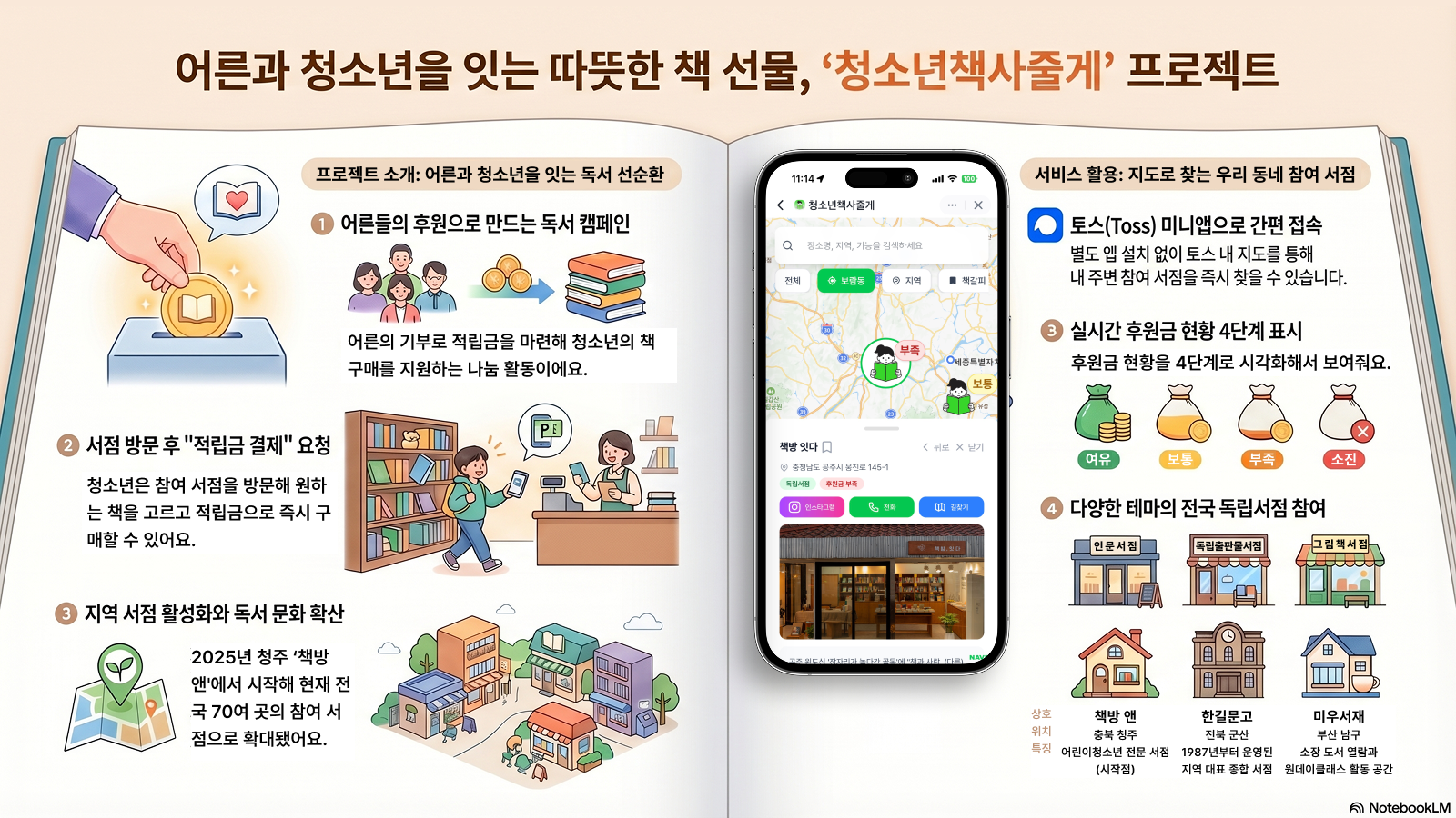 팀 동네서점은 오래전부터 "독립서점과 독자들에게 어떻게 하면 실질적이고 직접적인 도움을 줄 수 있을까"를 고민해 왔다. 그리고 작년 11월에 이 프로젝트에 관한 소식을 접하자 마자 참여 서점 20여 곳의 정보를 수집해 '청소년책사줄게' 테마지도를 열었다. 올해 들어 고민의 결과로 토스 미니앱이라는 해법을 찾게 됐다.