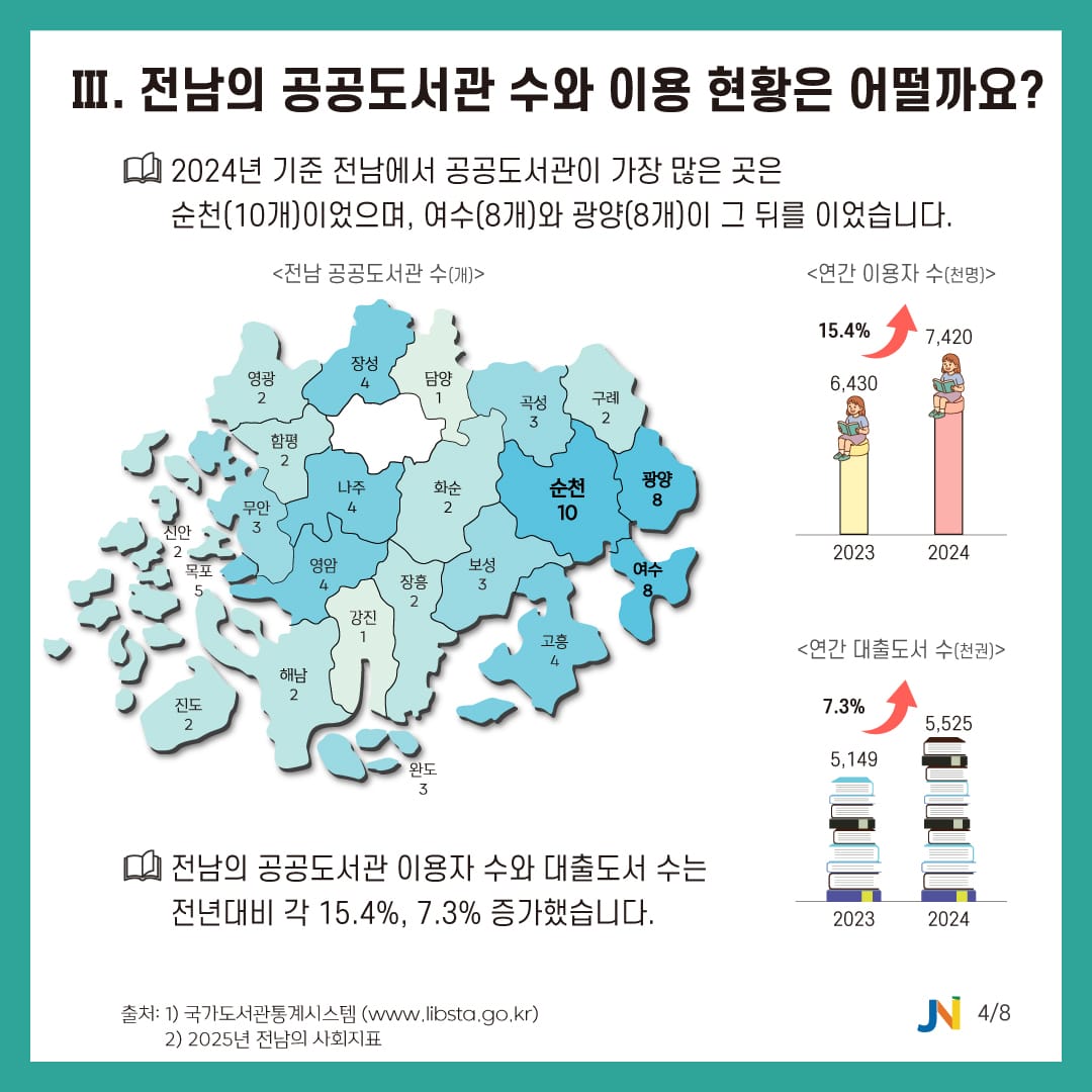 전라남도는 전국적으로 손꼽히는 독서 인프라를 갖추고 있습니다. 놀랍게도 2024년 기준 전남의 공공도서관 수는 총 77개로 전국에서 네 번째로 많습니다. 인구 100만 명당 공공도서관 수로 환산하면 43개에 달하는데, 이는 강원도에 이어 전국 2위에 해당하는 높은 수치입니다.