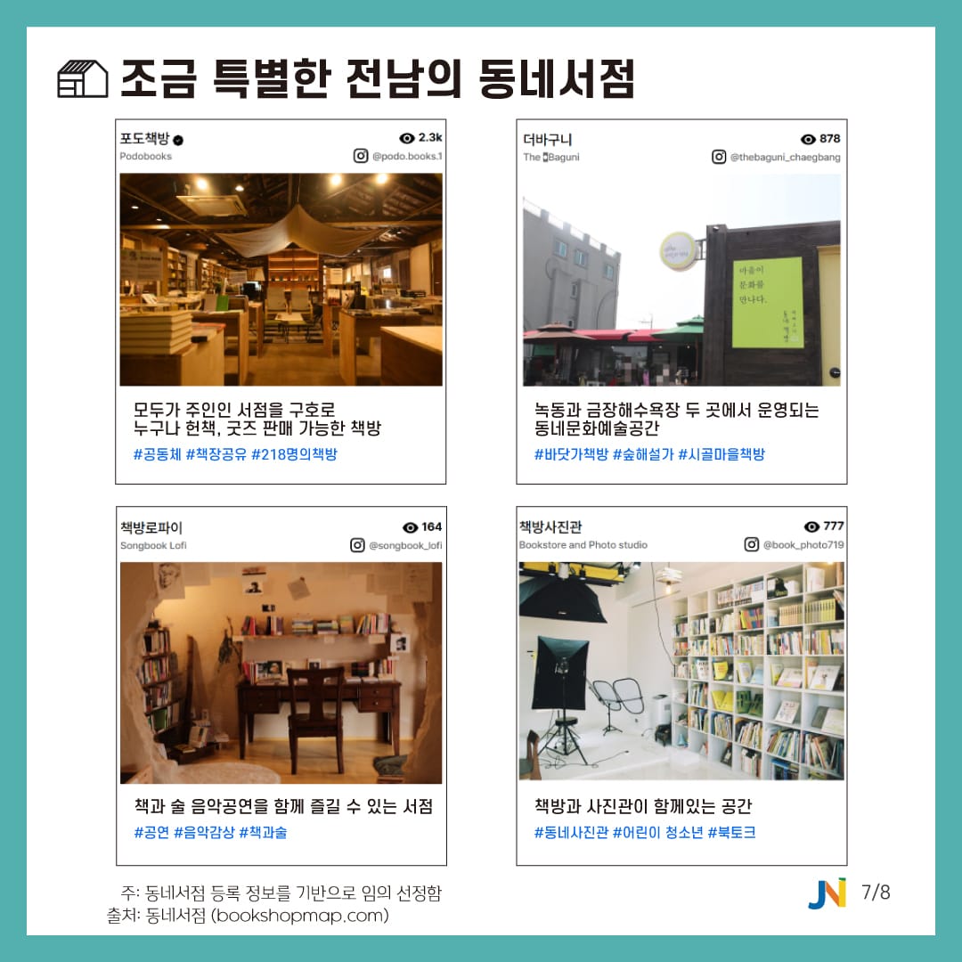 고흥, 곡성, 보성, 신안, 영광, 진도, 함평 등 무려 7개의 지역이 서점이 단 1곳뿐인 '소멸 위험 지역'으로 분류되었습니다. 동네서점 사이트(bookshopmap.com) 등록 기준으로 파악된 24곳의 서점마저도 목포(7곳), 순천(5곳), 여수(3곳) 등 일부 도시에 집중되어 있어, 지역 간 문화 접근성의 격차가 심각한 문제로 떠오르고 있습니다. 책을 빌려볼 도서관은 많지만, 내 돈으로 새 책을 사고 문화적 영감을 얻을 서점은 점점 사라지고 있는 것입니다.