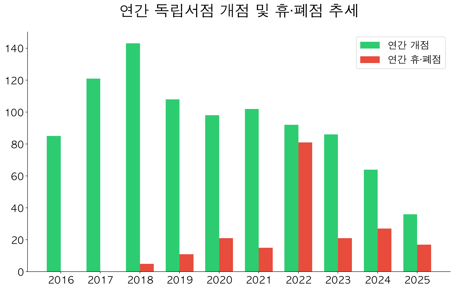 - 창업 열기의 냉각: 2018년 연간 143곳을 정점으로 신규 개점은 지속 감소해 2025년에는 36곳까지 줄었습니다. 7년 사이에 4분의 1 수준으로 급감한 수치입니다.