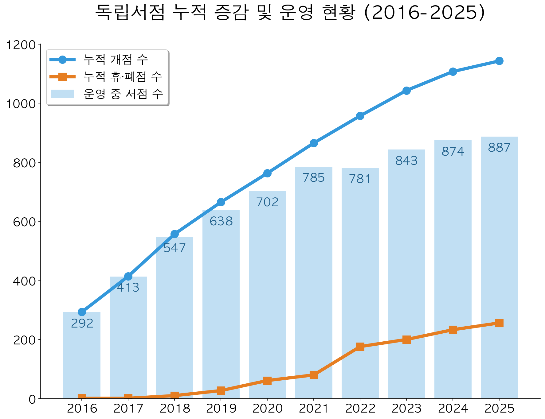 - 생존 교체 장세 진입: 2024년 42.2%, 2025년 47.2%의 휴·폐점율은 더 이상 서점의 수가 자동으로 늘어나지 않는 포화 및 교체 장세로 진입했음을 보여줍니다.