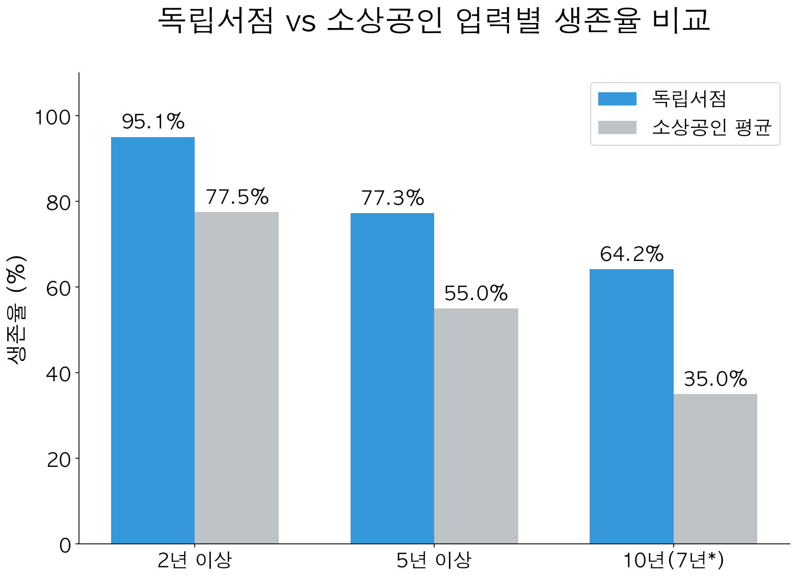 | 7년 이상 생존 | 64.2% | 35.8% | 10년 내 약 60-70% 수준 | 독립서점이 우수 | 2016~2018년 개점 349곳 대상 |