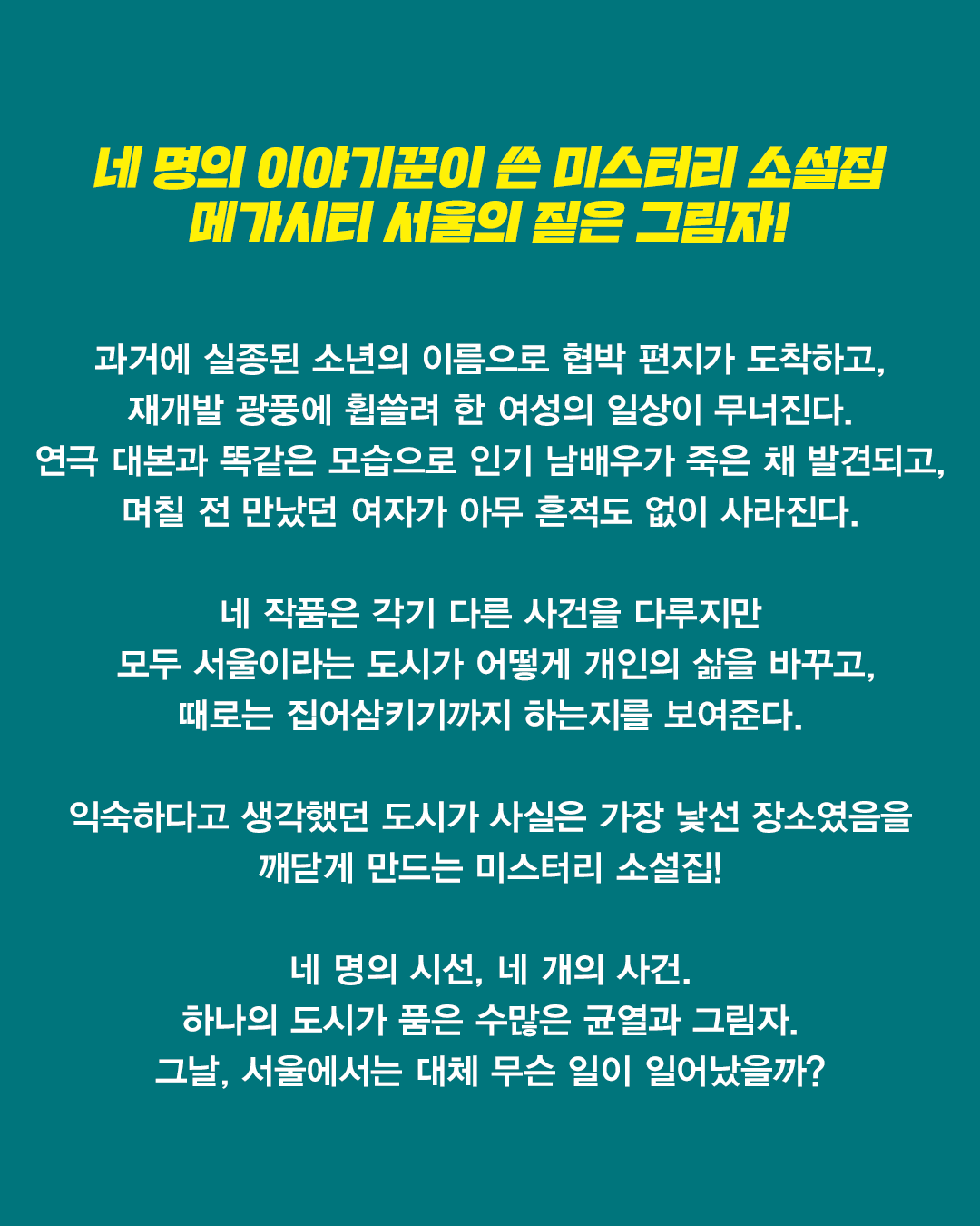 β β β β β μ λͺ μ, μ΅νλ, κΉμμ§, μ½λ¦° λ§μ¬ λ€ λͺ μ μ΄μΌκΈ°κΎΌμ΄ μ΄ λ―Έμ€ν°λ¦¬ μμ€μ§. νλ €ν λμ μμΈμ μ΄λ©΄μ κ°μΆ°μ§ λ€ κ°μ§ μ¬κ±΄μ ν΅ν΄ λμμ μ΄λμ΄ κ·Έλ¦Όμλ₯Ό λ΄μλλ€.