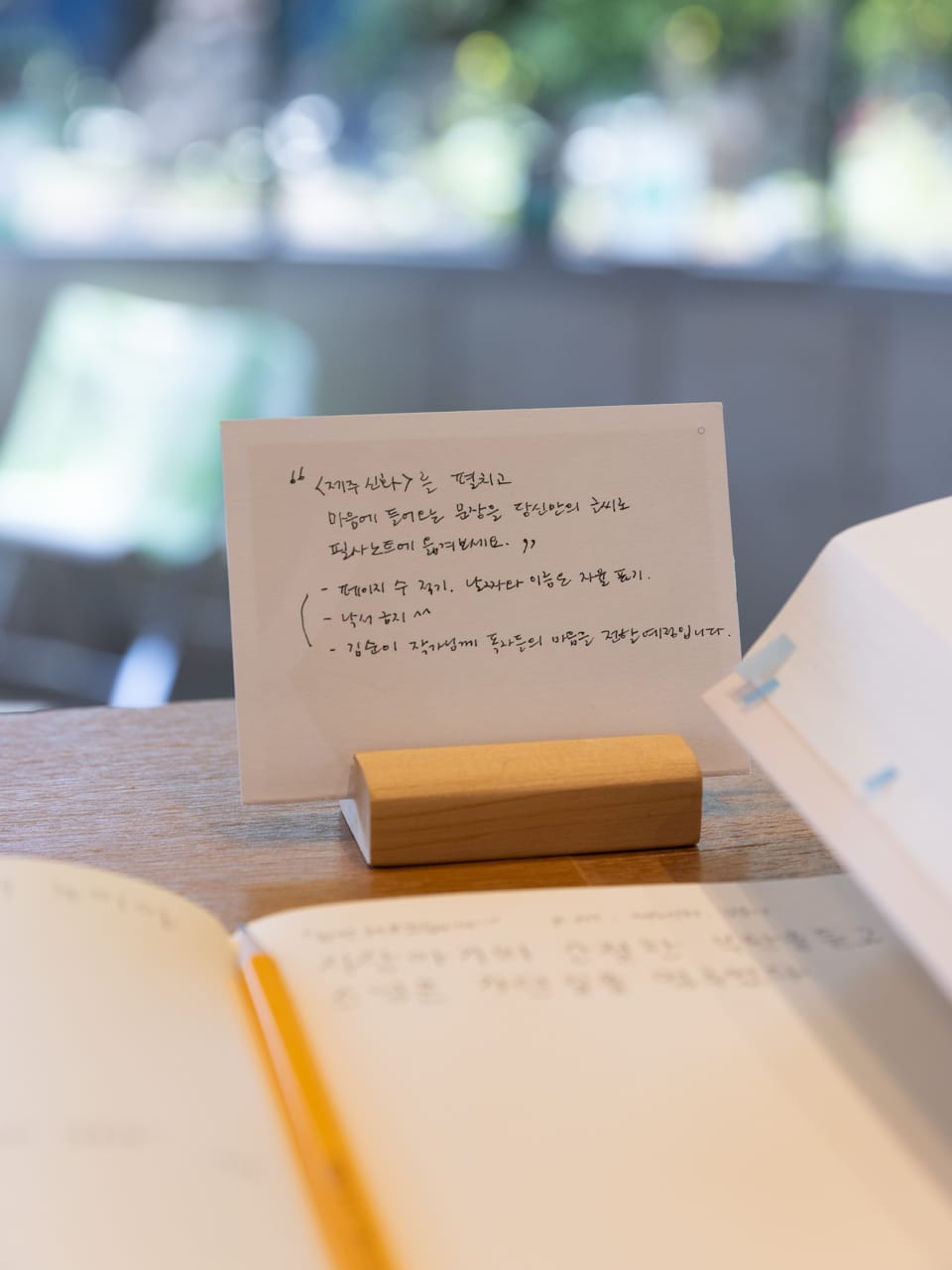 무명서점은 그야말로 자연에 둘러싸여 있습니다. 서점으로 들어서는 길은 계절마다 색다르게 아름답습니다. 봄에는 벛꽃 터널이 생기고, 꽃이 지고 난 후에는 초록이 무성한 길을 영혜 님은 드라이브 코스로 추천했습니다. 물론 걸어서 가볍게 산책하기에도 참 좋습니다. 근처에 있는 현대미술관, 김창열 미술관도 둘러보면 어떨까요?