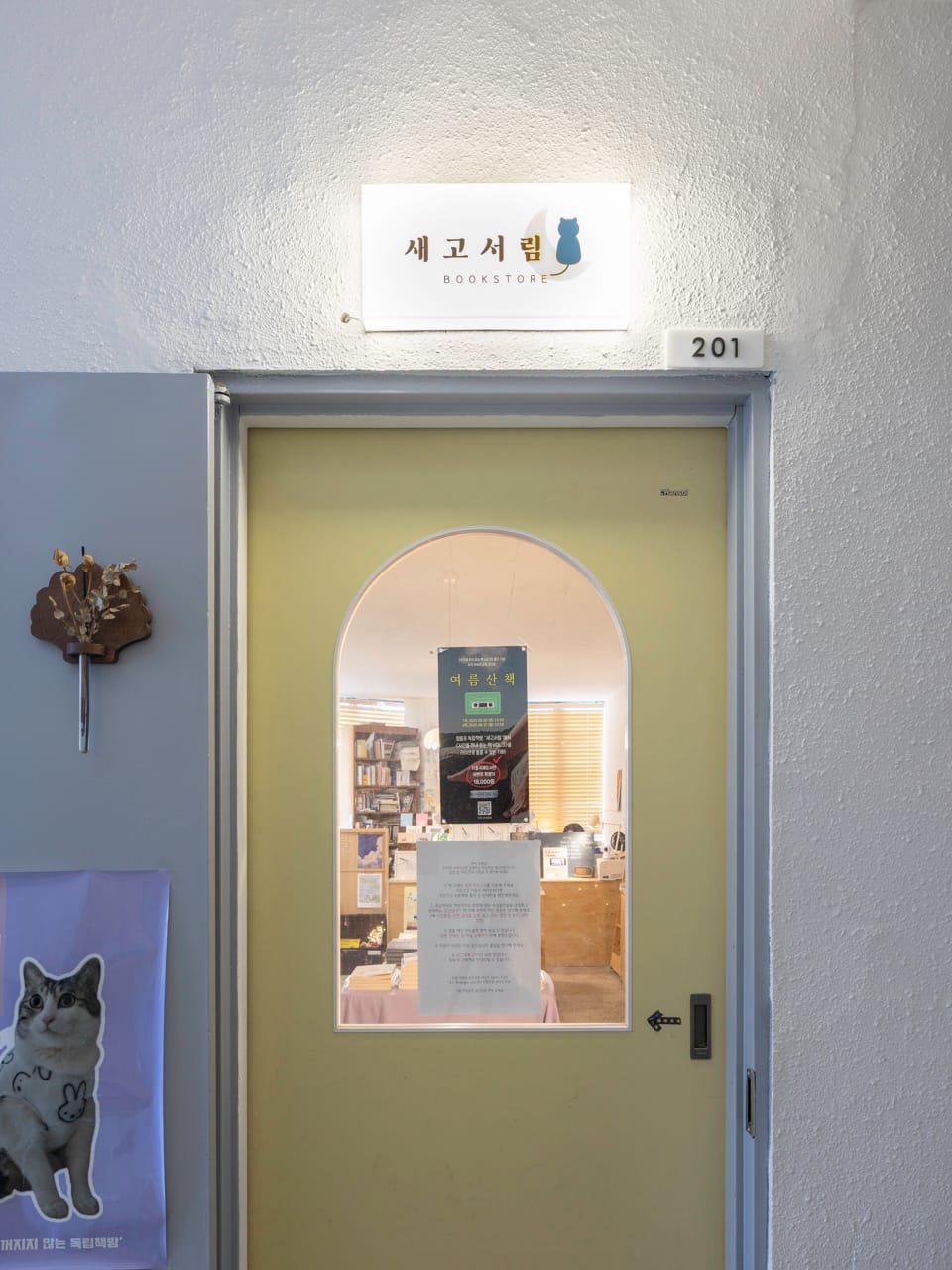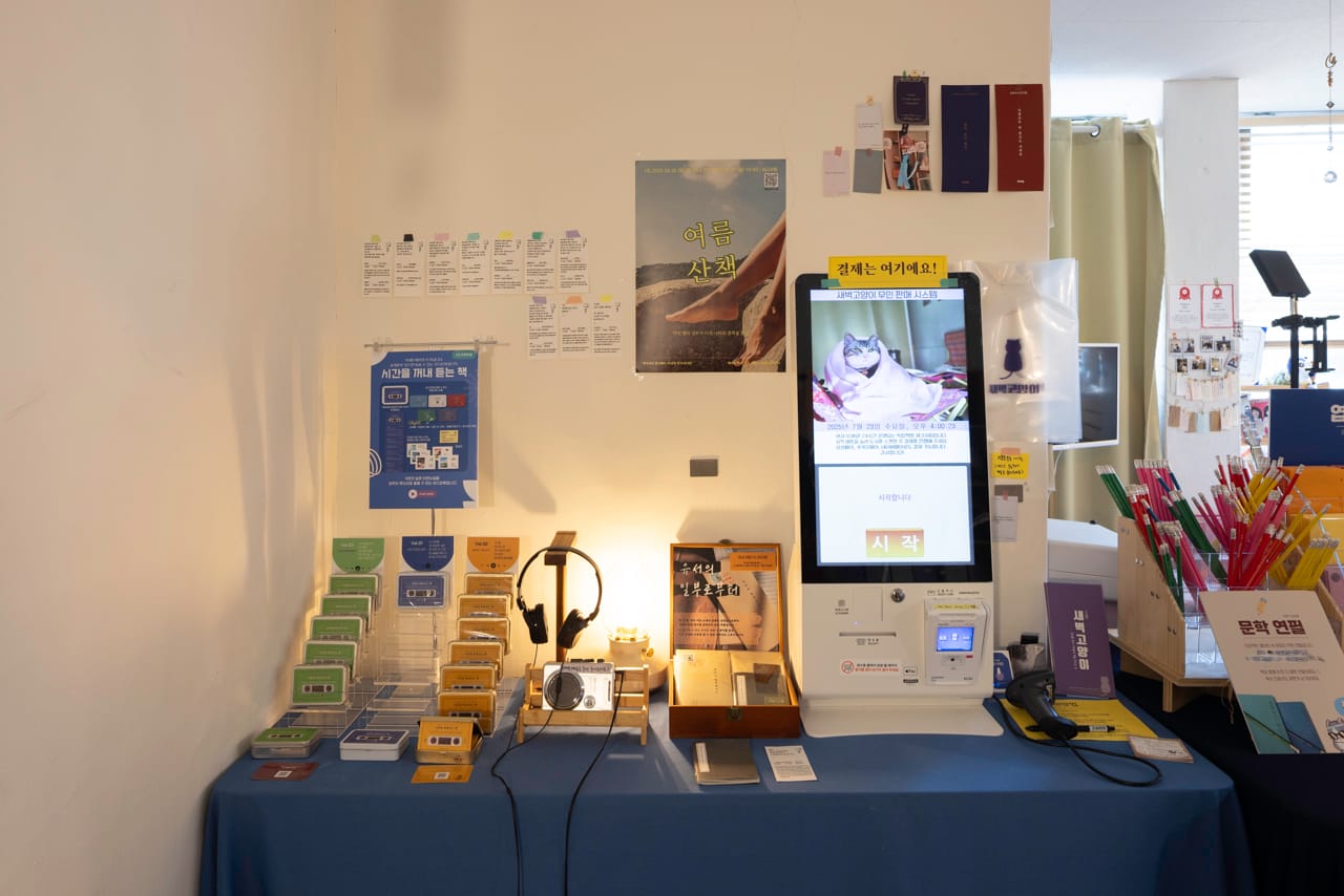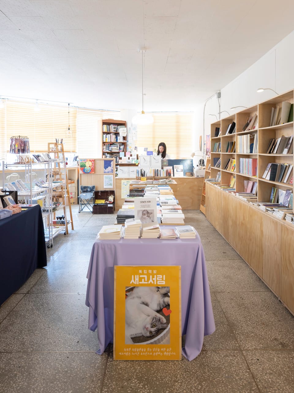 작은 무인 서점 ‘새고서림’은 독립출판 작가 수민 님이 운영해요. 일본문학 기반의 ‘프로젝트 메이지’와 항공권·오디오북 형태의 독특한 책들을 선보이고 있어요. 언제든 열려 있는 공간에서 책의 다채로움을 느낄 수 있답니다.